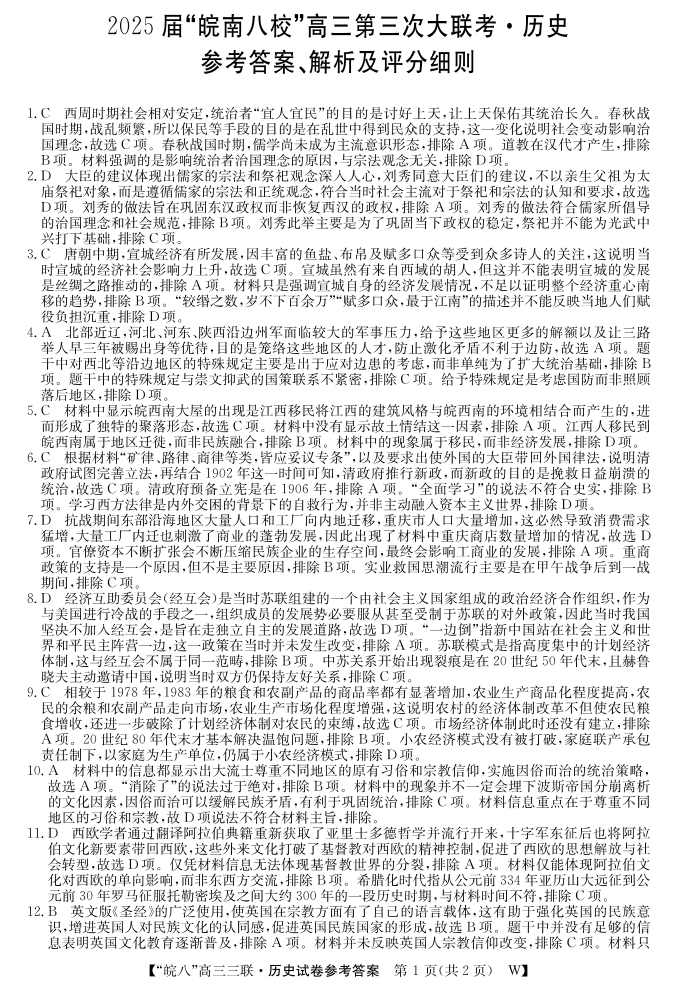 安徽省皖南八校2024-2025学年下学期高三第三次联考历史答案