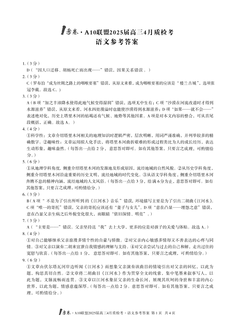 安徽省1号卷·A10联盟2024-2025学年下学期4月高三质检考语文答案