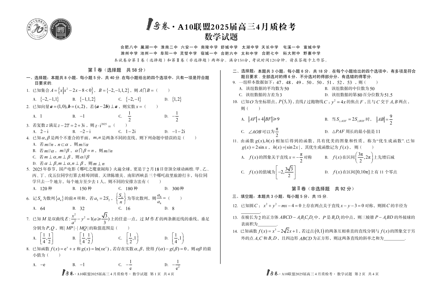安徽省1号卷·A10联盟2024-2025学年下学期4月高三质检考数学