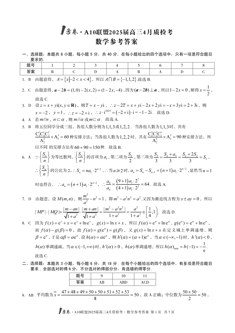 安徽省1号卷·A10联盟2024-2025学年下学期4月高三质检考数学答案