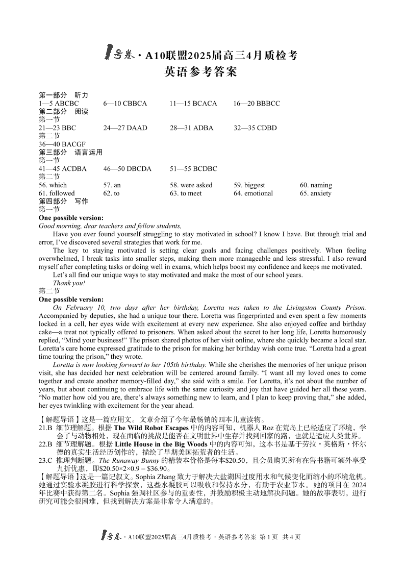 安徽省1号卷·A10联盟2024-2025学年下学期4月高三质检考英语答案