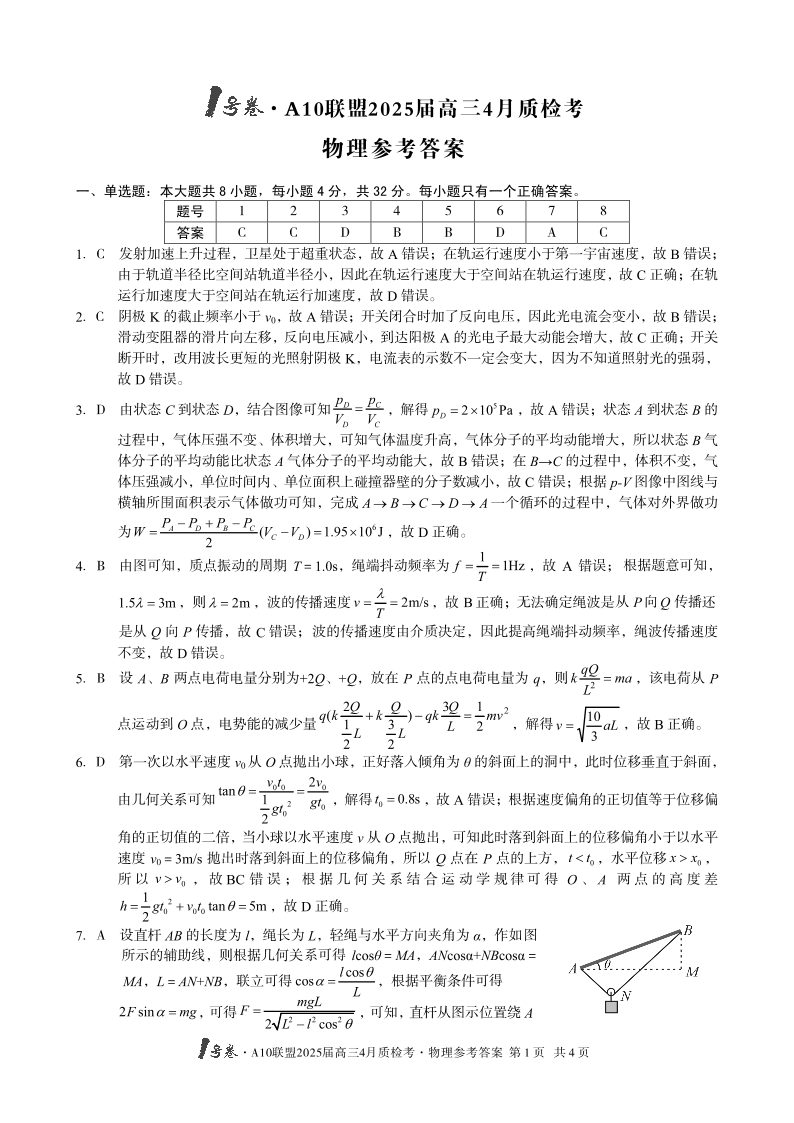 安徽省1号卷·A10联盟2024-2025学年下学期4月高三质检考物理答案