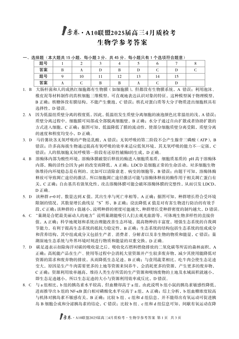 安徽省1号卷·A10联盟2024-2025学年下学期4月高三质检考生物学答案