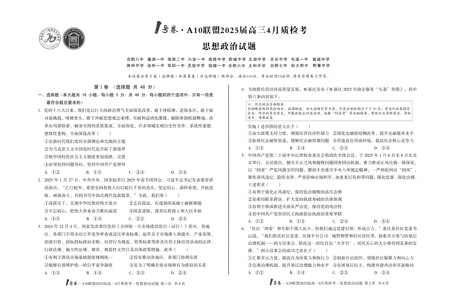 安徽省1号卷·A10联盟2024-2025学年下学期4月高三质检考政治