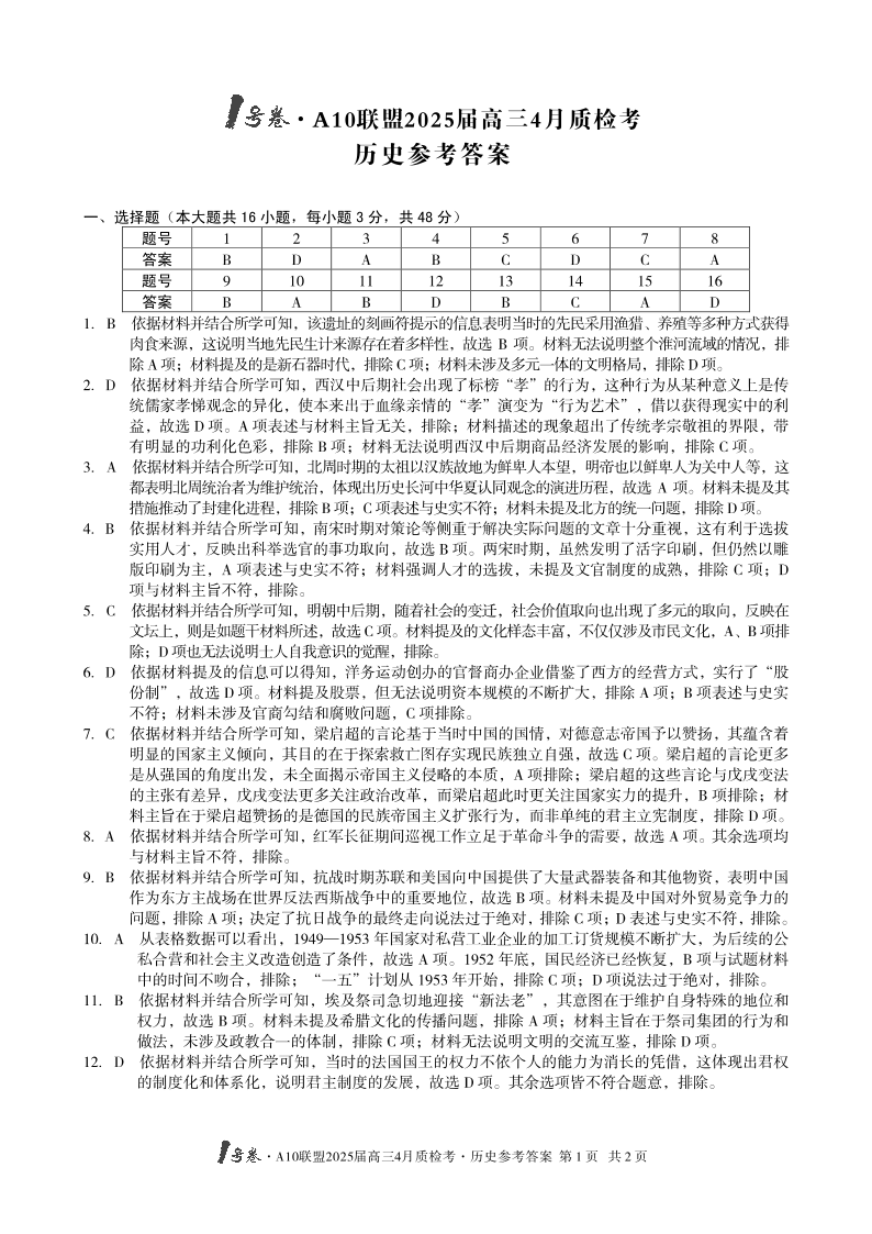 安徽省1号卷·A10联盟2024-2025学年下学期4月高三质检考历史答案