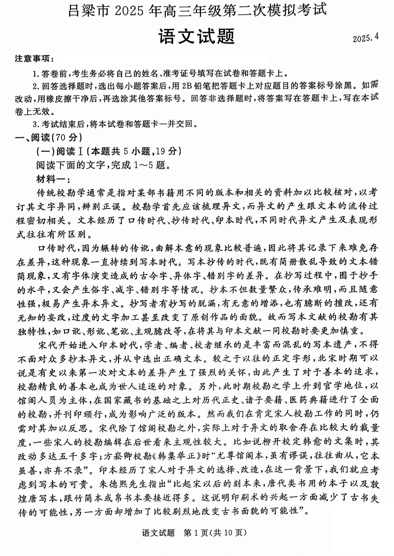 山西省吕梁市2024-2025学年下学期高三二模考试语文