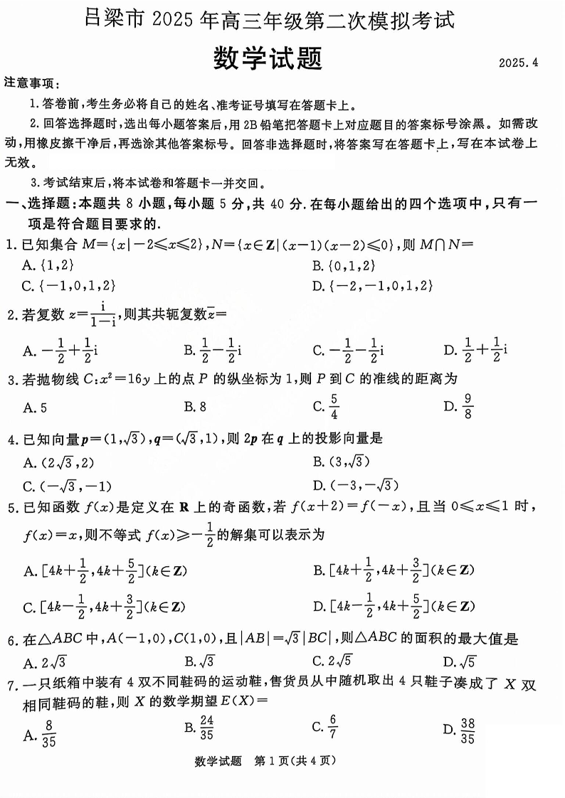 山西省吕梁市2024-2025学年下学期高三二模考试数学