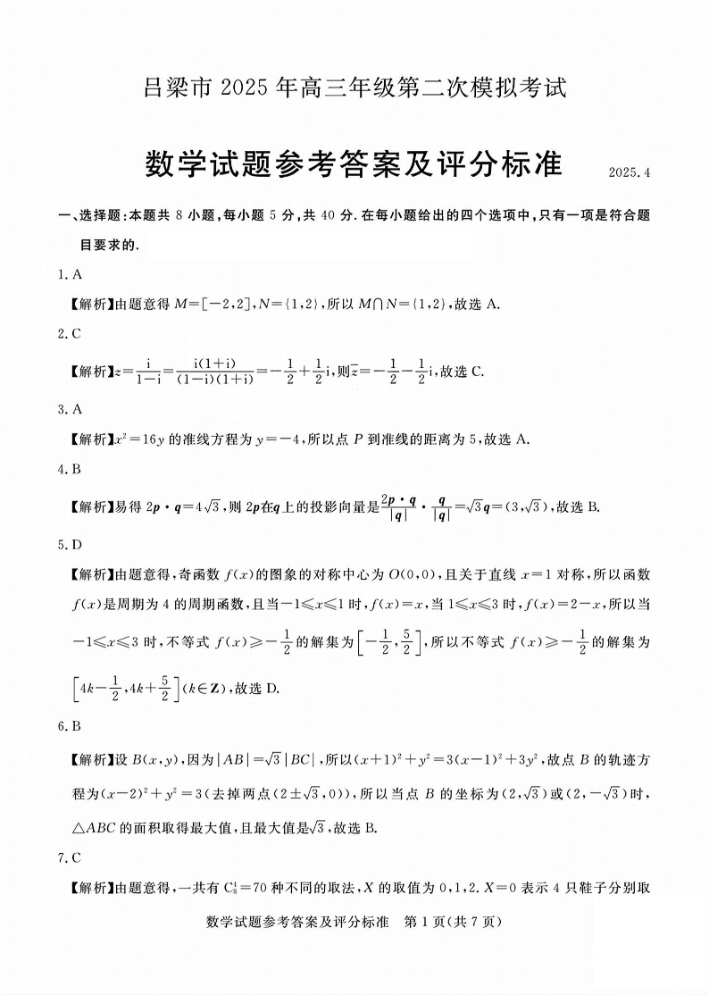 山西省吕梁市2024-2025学年下学期高三二模考试数学答案