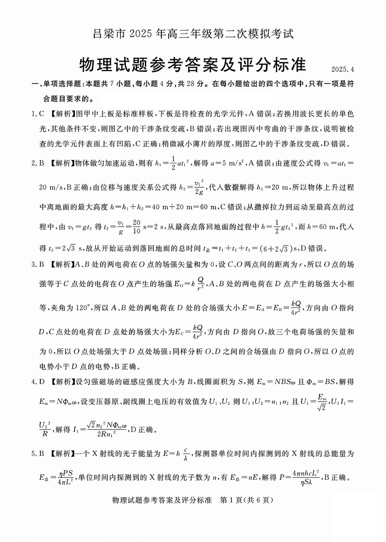 山西省吕梁市2024-2025学年下学期高三二模考试物理答案