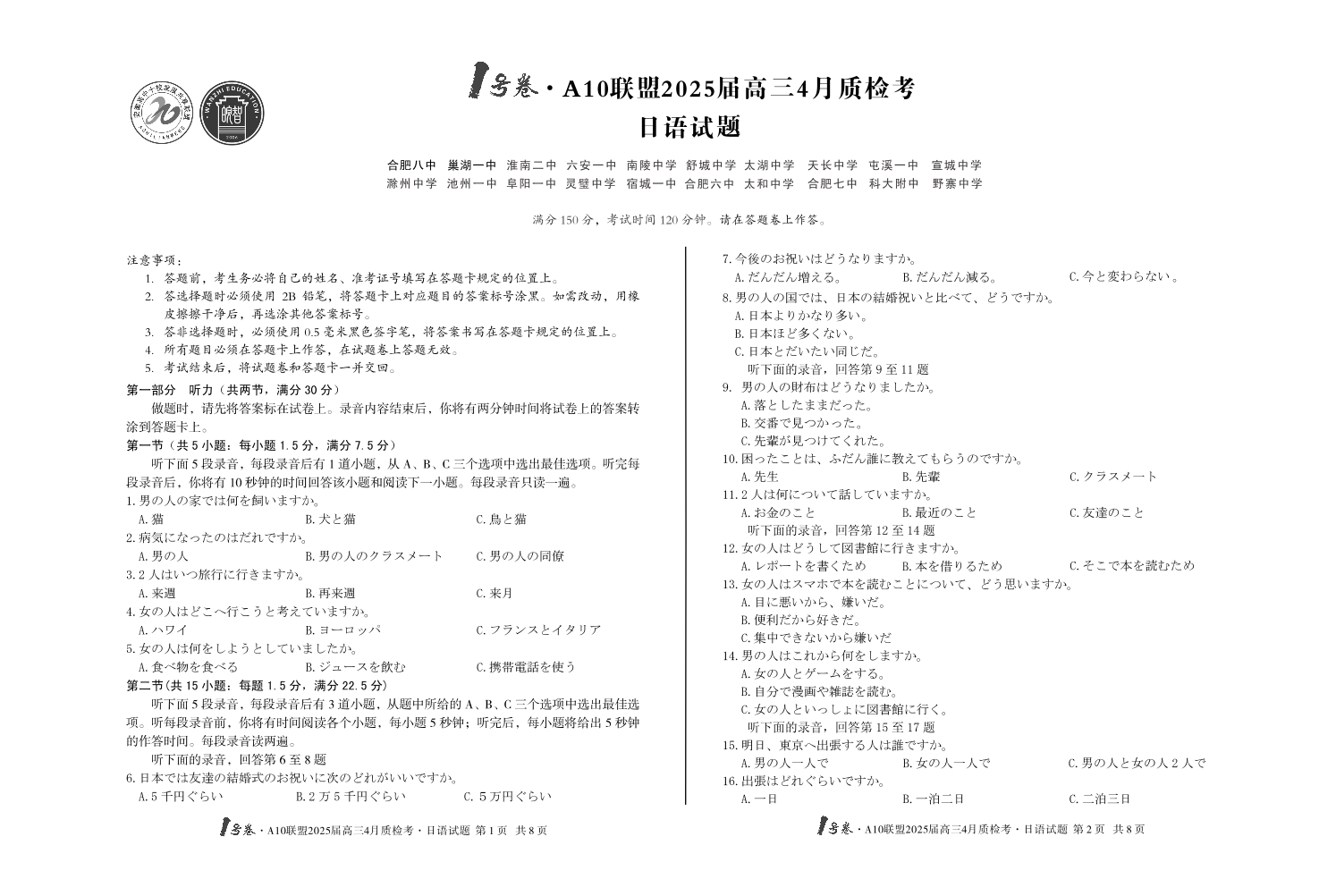 安徽省1号卷·A10联盟2024-2025学年下学期4月高三质检考日语