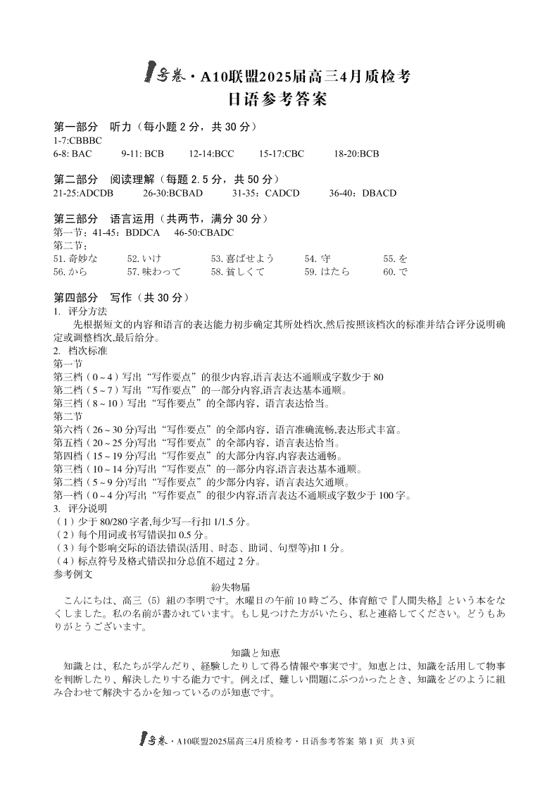 安徽省1号卷·A10联盟2024-2025学年下学期4月高三质检考日语答案