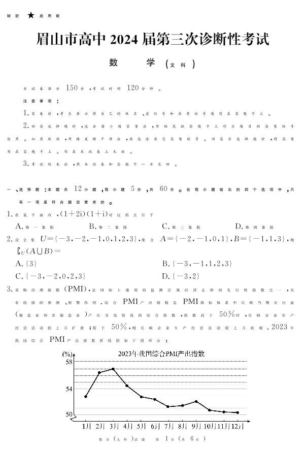 四川省眉山市2024届高三下学期第三次诊断考试文科数学