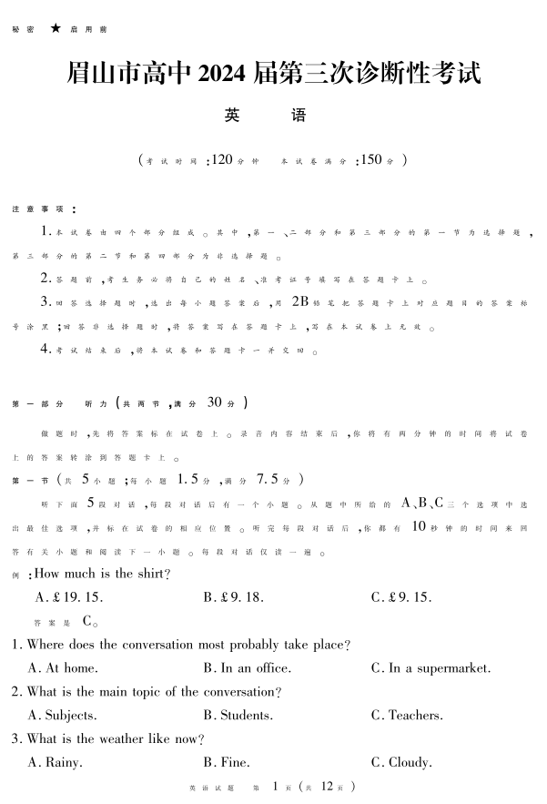 四川省眉山市2024届高三下学期第三次诊断考试英语