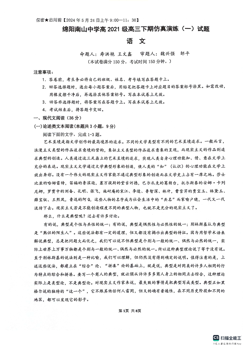 四川省绵阳南山中学2024届高三下学期高考仿真演练(一)语文+答案