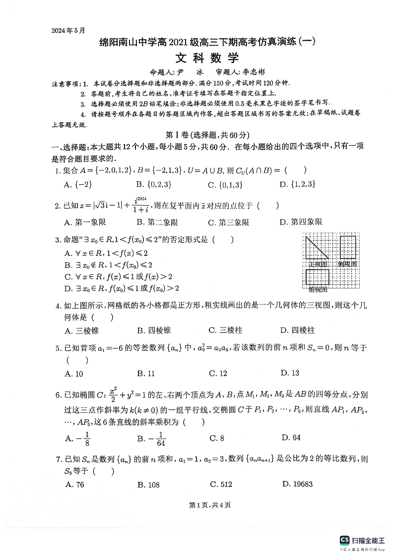 四川省绵阳南山中学2024届高三下学期高考仿真演练(一)文科数学+答案