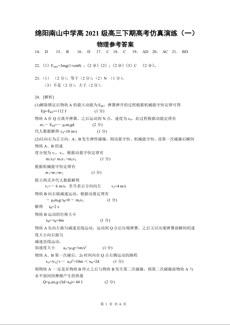 四川省绵阳南山中学2024届高三下学期高考仿真演练(一)理综答案