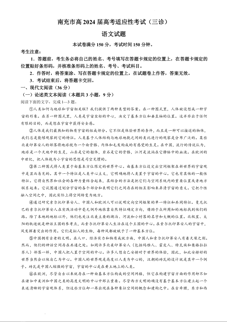 四川省南充市2024届高三下学期三诊考试(南充三诊)语文