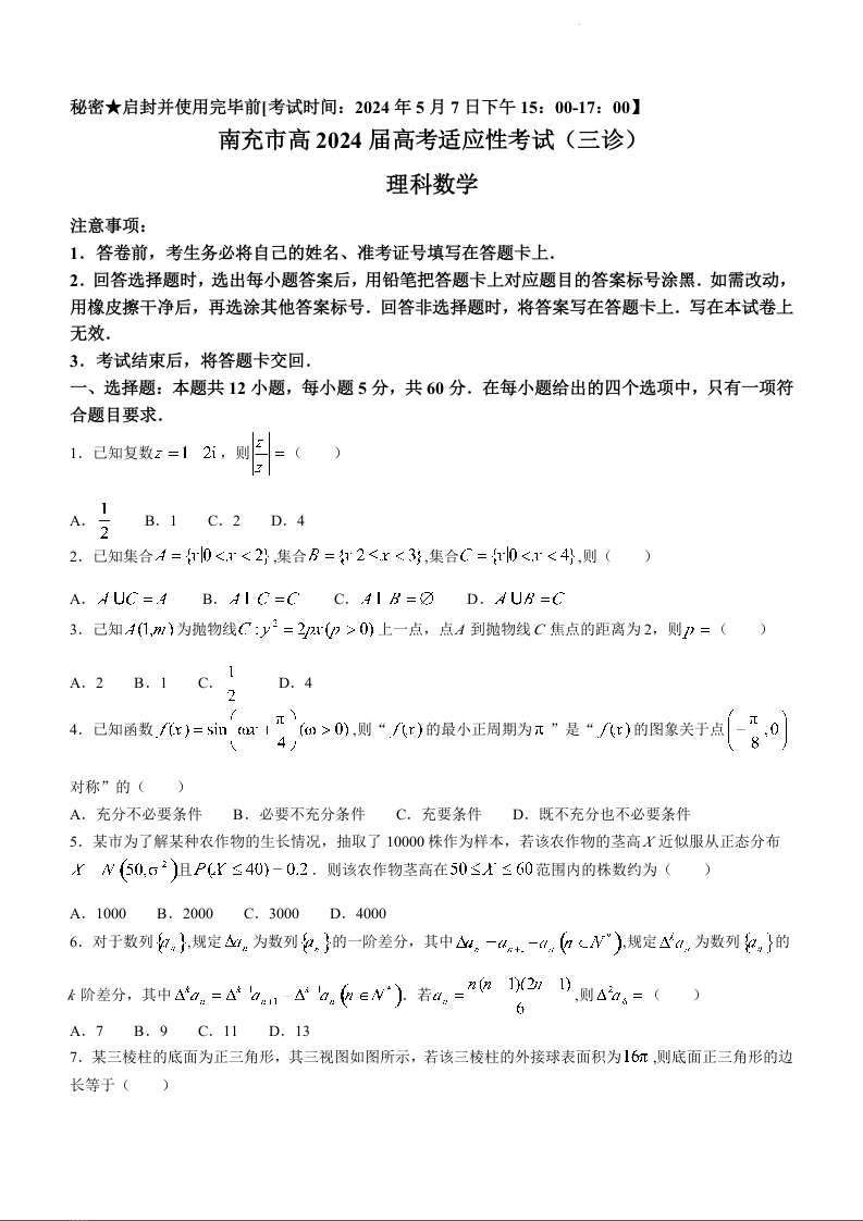 四川省南充市2024届高三下学期三诊考试(南充三诊)理科数学