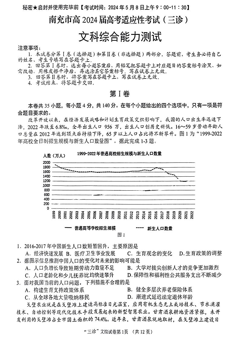 四川省南充市2024届高三下学期三诊考试(南充三诊)文综