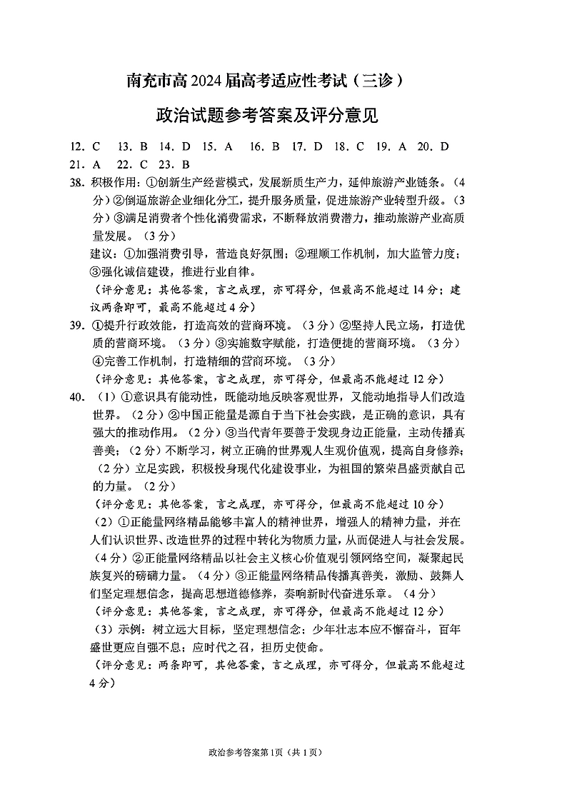 四川省南充市2024届高三下学期三诊考试(南充三诊)文综答案