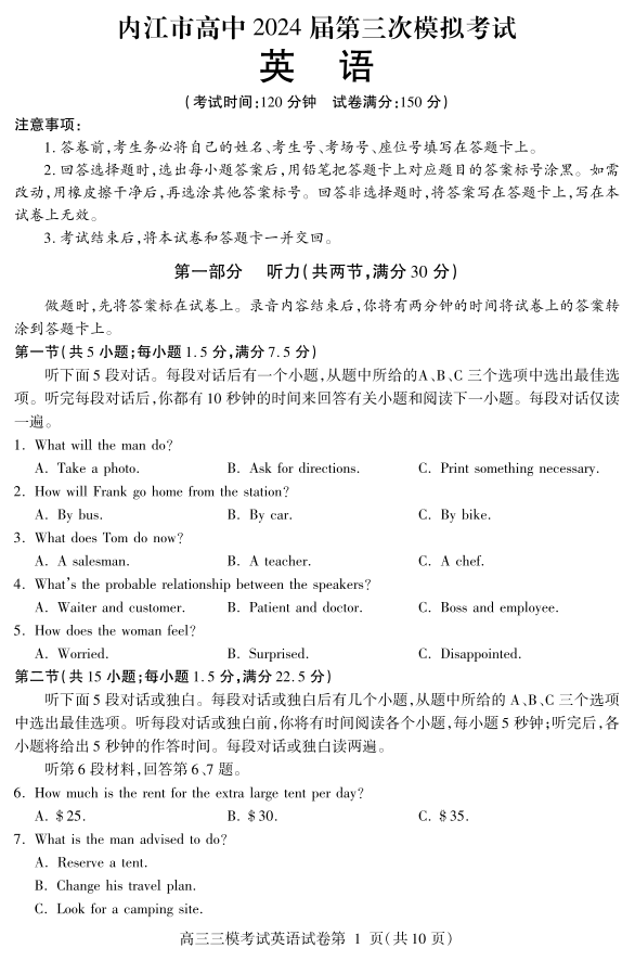 四川省内江市2024届高中高三下学期第三次模拟考试英语+答案