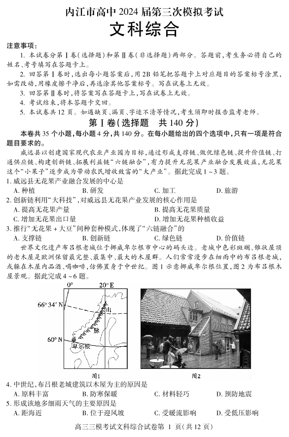 四川省内江市2024届高中高三下学期第三次模拟考试文综+答案