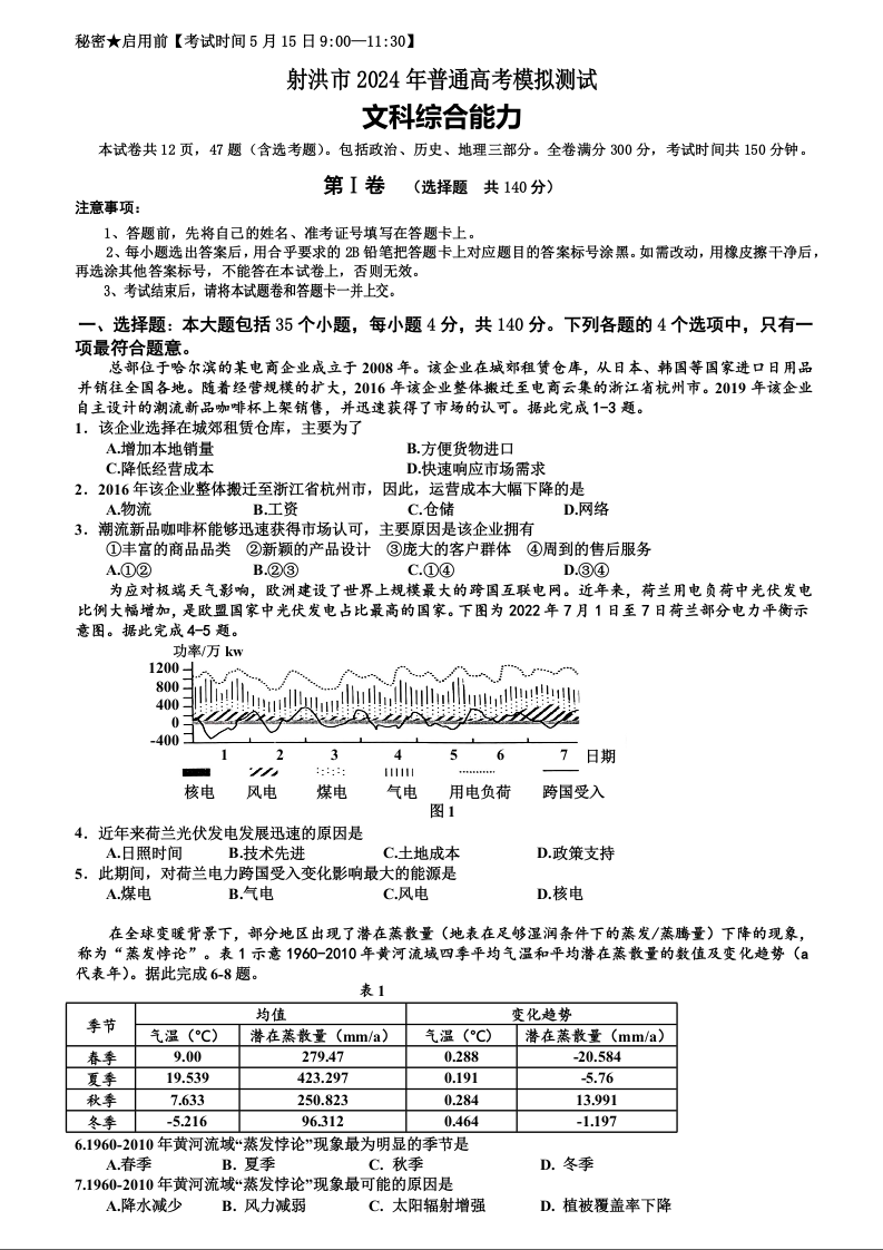 四川省射洪市2024届高三下学期5月高考模拟文综+答案