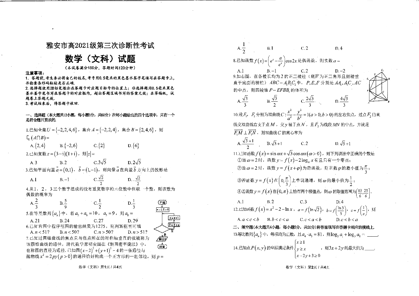 四川省雅安市2024届高三下学期第三次诊断性考试文科数学