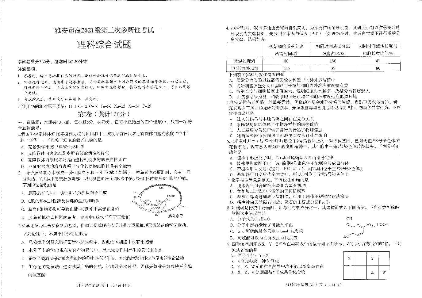 四川省雅安市2024届高三下学期第三次诊断性考试理综