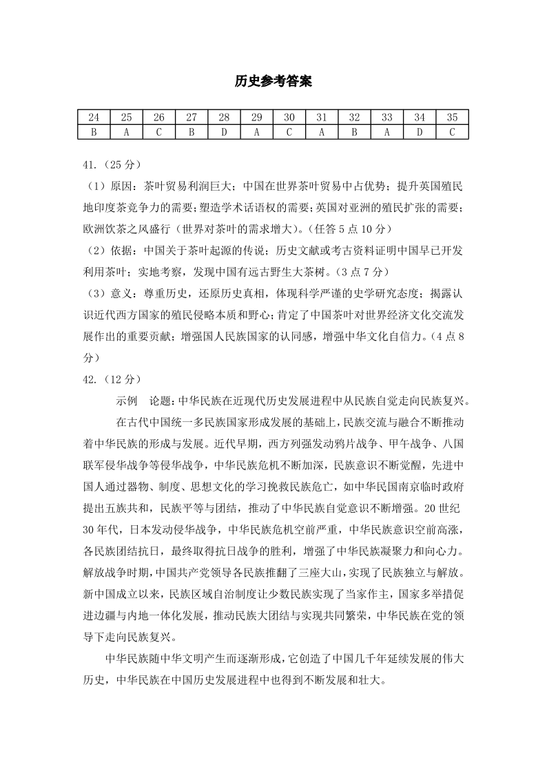 四川省雅安市2024届高三下学期第三次诊断性考试历史答案