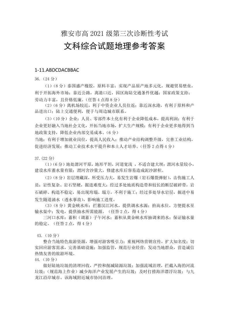 四川省雅安市2024届高三下学期第三次诊断性考试地理答案