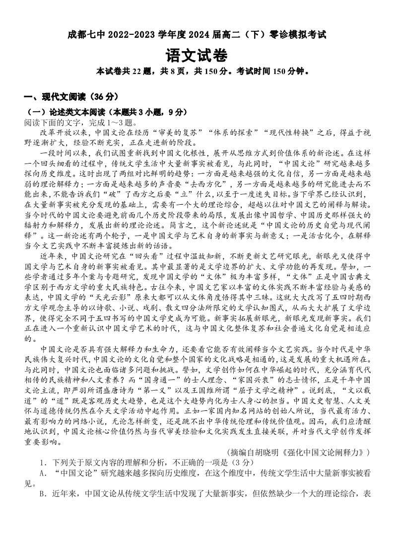 四川省成都市第七中学2024届高三零诊模拟考试语文