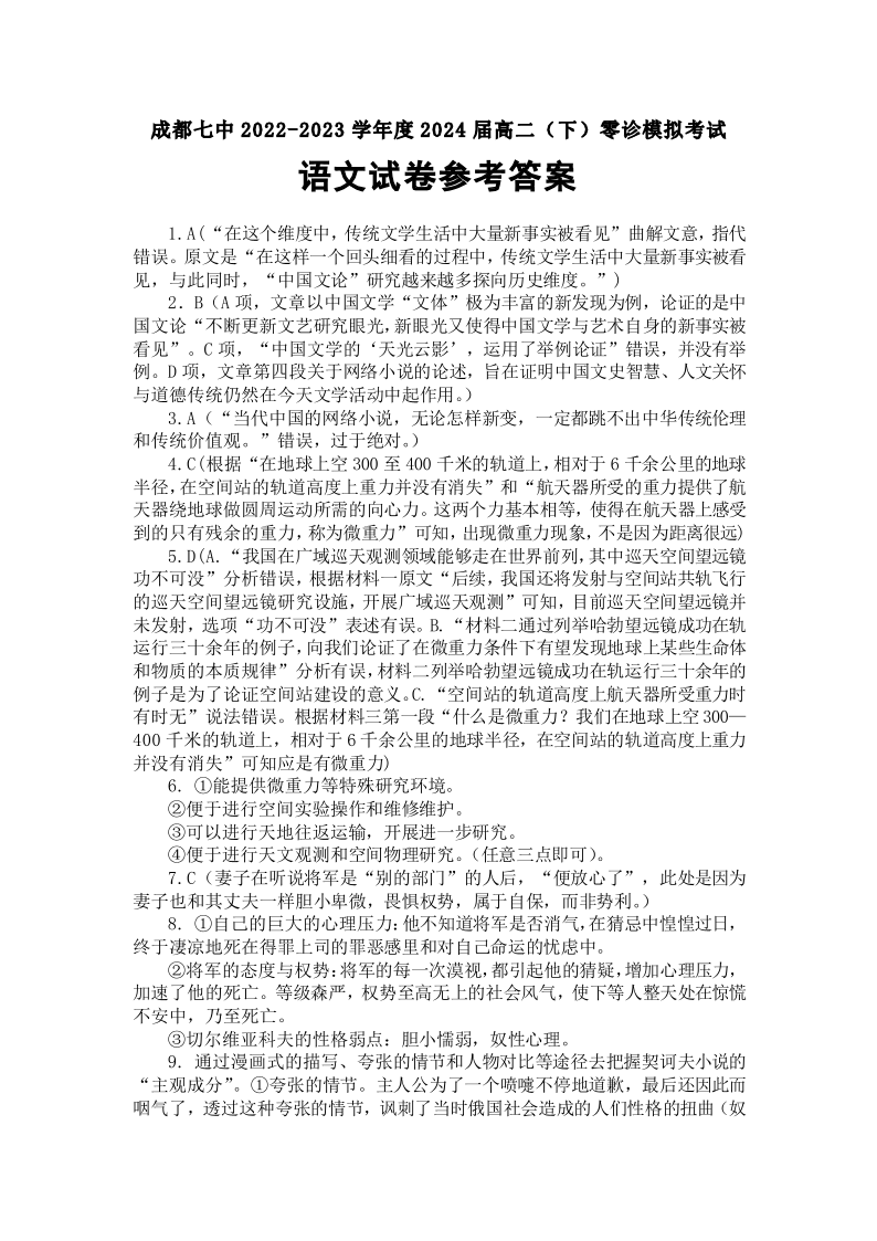四川省成都市第七中学2024届高三零诊模拟考试语文答案