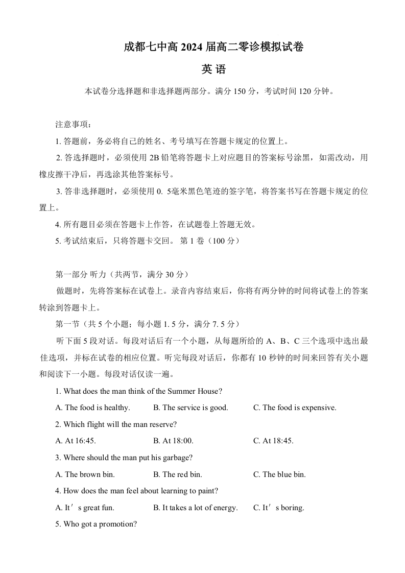 四川省成都市第七中学2024届高三零诊模拟考试英语听力+答案