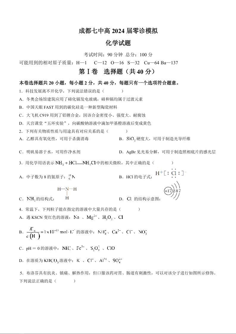 四川省成都市第七中学2024届高三零诊模拟考试化学+答案