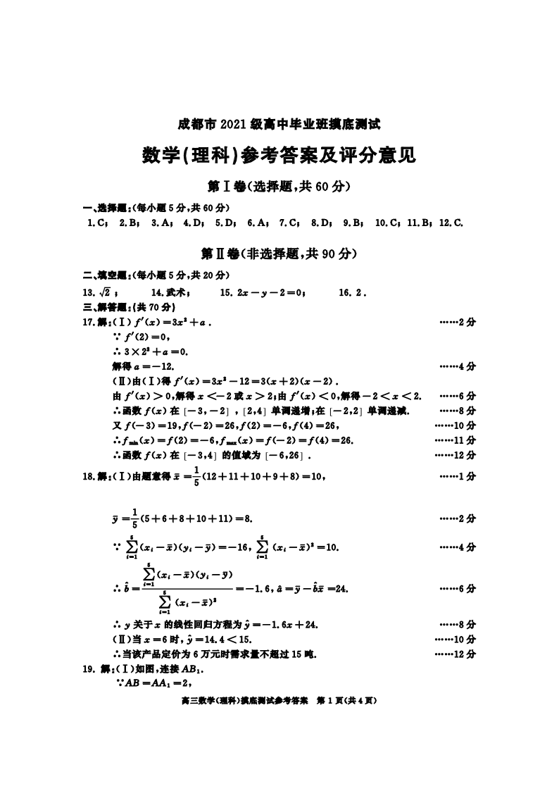 四川省成都市2024届下学期期末零诊测试理科数学答案