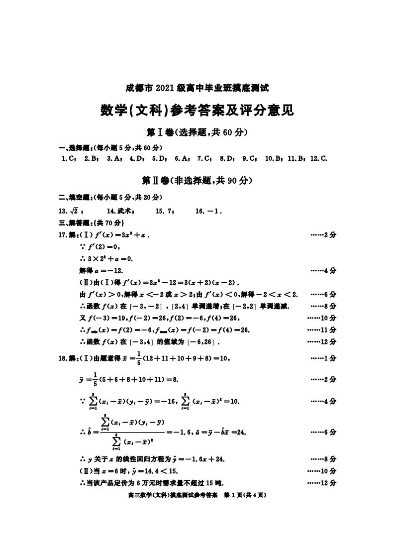 四川省成都市2024届下学期期末零诊测试文科数学答案
