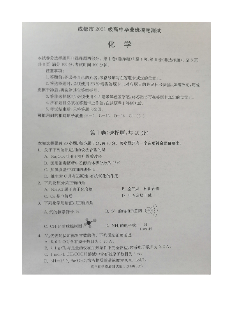 四川省成都市2024届下学期期末零诊测试化学