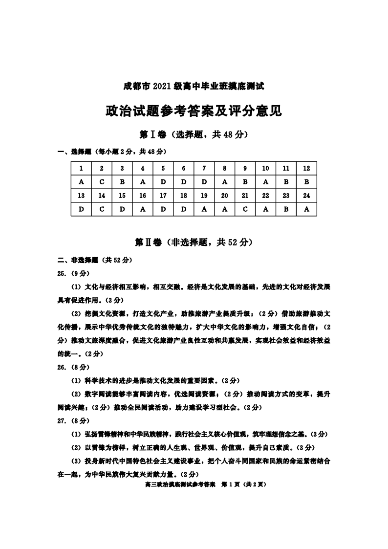 四川省成都市2024届下学期期末零诊测试政治答案