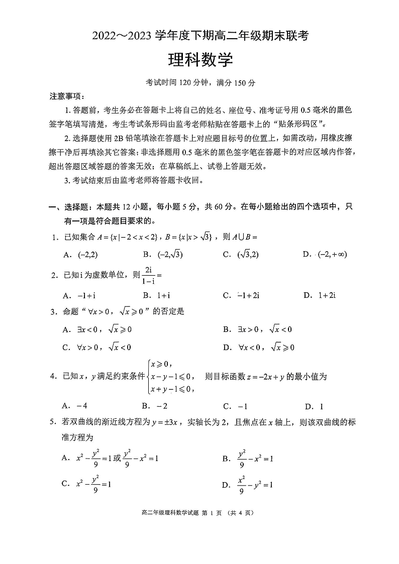 四川省成都市蓉城联盟2024届下学期期末联考理科数学