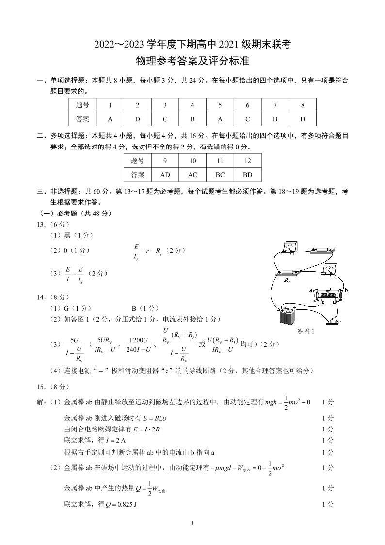 四川省成都市蓉城联盟2024届下学期期末联考物理答案