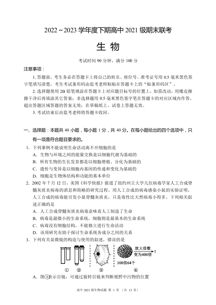 四川省成都市蓉城联盟2024届下学期期末联考生物