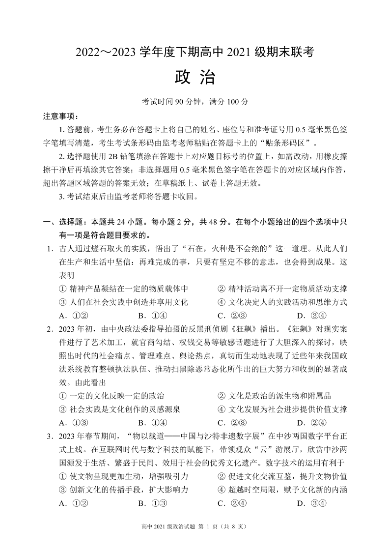 四川省成都市蓉城联盟2024届下学期期末联考政治