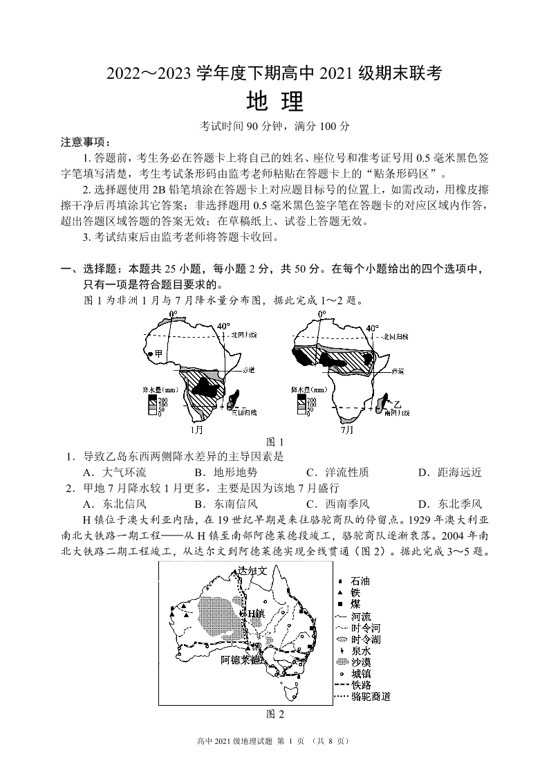四川省成都市蓉城联盟2024届下学期期末联考地理