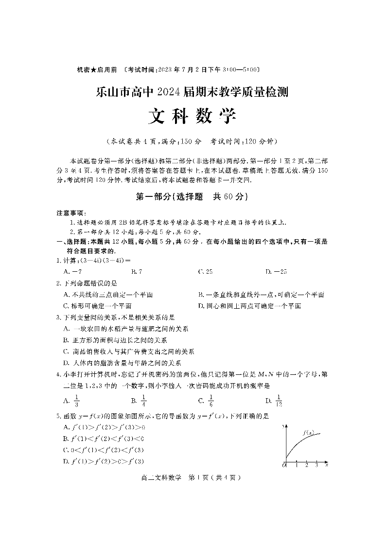 四川省乐山市2024届下学期期末教学质量检测文科数学+答案