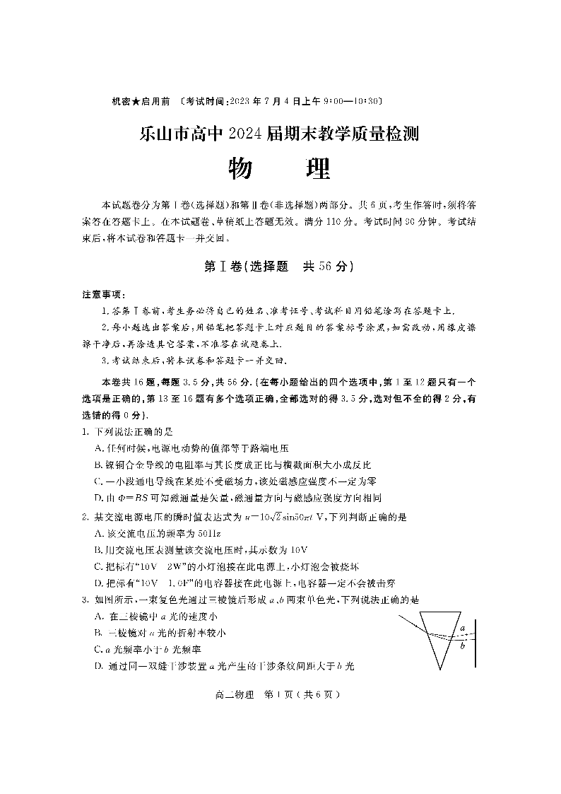 四川省乐山市2024届下学期期末教学质量检测物理+答案