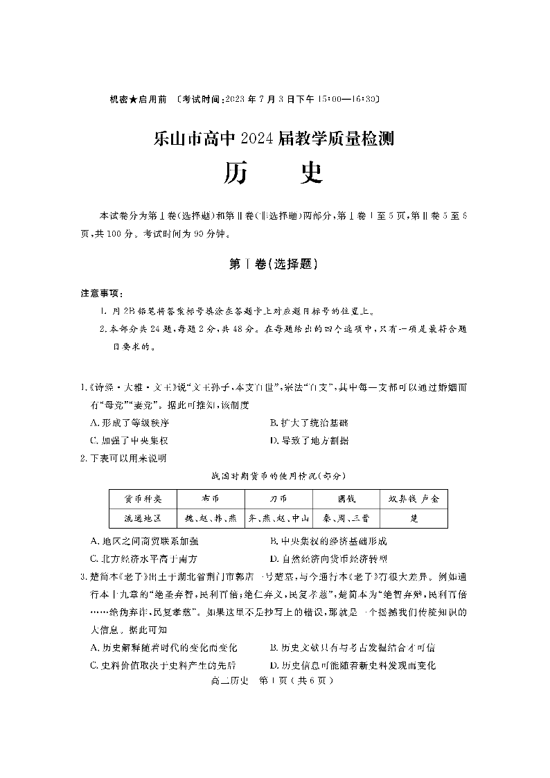 四川省乐山市2024届下学期期末教学质量检测历史+答案