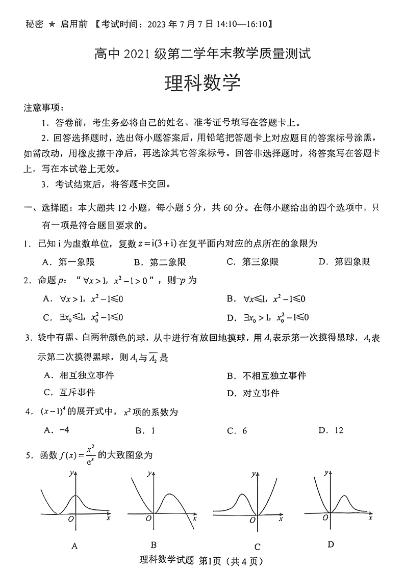 四川省绵阳市高中2024届下学期期末教学质量测试理科数学