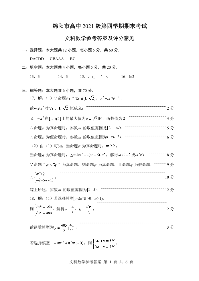 四川省绵阳市高中2024届下学期期末教学质量测试文科数学答案