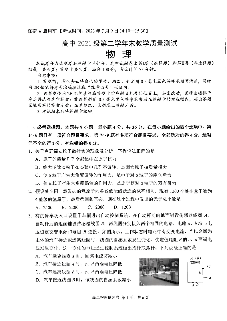 四川省绵阳市高中2024届下学期期末教学质量测试物理